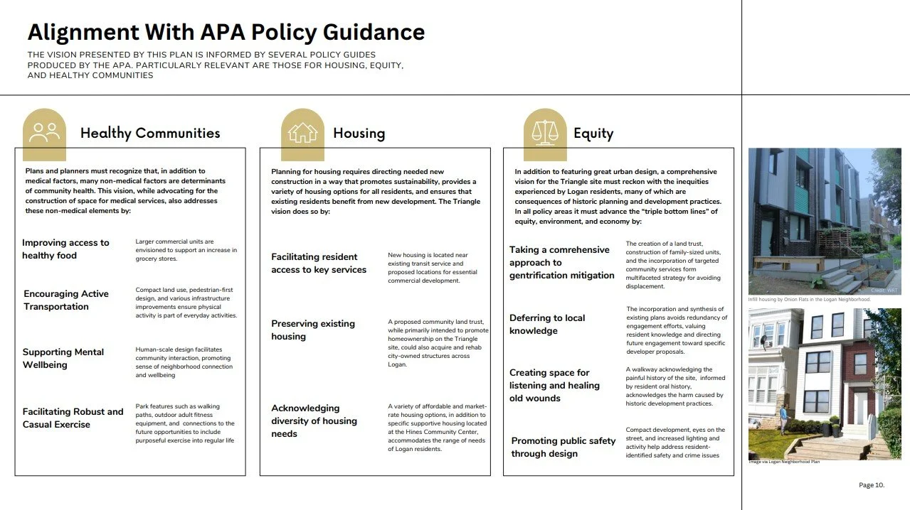 Another responsibility of mine was to ensure our plan’s alignment with the various APA policy guides, primarily those concerning Healthy Communities, Housing, and Equity.